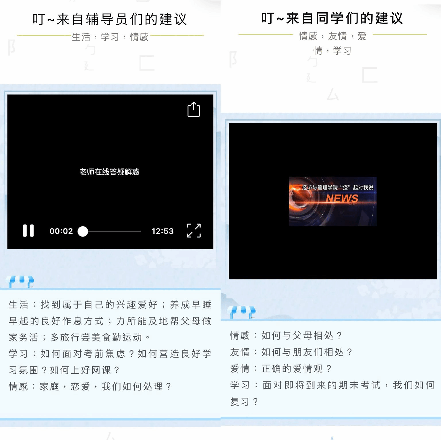 本期活动旨在通过学生和辅导员两个角度进行解答疑惑,帮助学生疏通心理。大家针对上一期同学们拍摄的情景剧中所展示的问题,辅导员和同学们分别录制视频,有针对性的给出建议,同学们纷纷表示,通过此次活动收益良多。至此,本次心理健康节三期活动已圆满结束。第一期同学们分享故事,第二期用情景剧展现故事,第三期答疑解惑。每一期都在用不同的形式向大家传递心理健康的重要性。