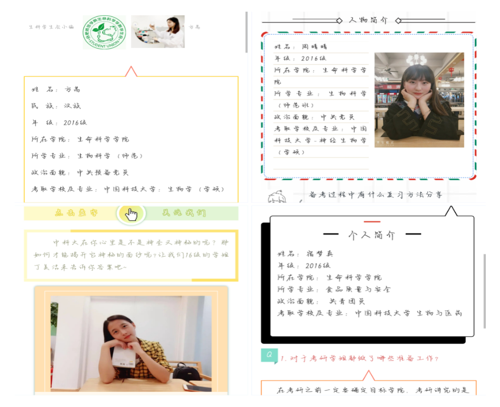 通过生命科学学院学生会微信平台,用学生喜闻乐见的新媒体方式和活泼的语言,连续推送多名生命科学学院考入中科大研究生的考研心得,让典型事迹贴近学生,贴近校园生活,让他们的学习经历、奋斗精神,成为全院学生的思想引领、精神激励。