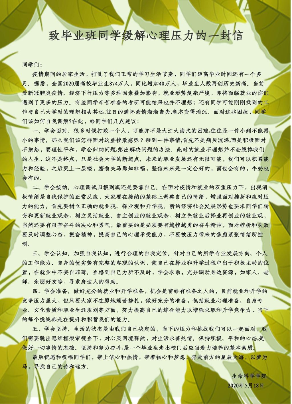 本网讯 在全国第二十一个“5·25”心理健康节来临之际,为进一步加强毕业班学生心理健康教育,推进生命科学学院在新冠肺炎疫情影响下的心理育人工作,切实提高毕业生心理健康水平和心理素质,帮助毕业生处理好学习成才、求职择业等方面的困扰,引导大家树立理性平和、积极向上的健康心态面对毕业和就业,生命科学学院面向全体毕业班学生发放线上《致毕业班同学缓解心理压力的一封信》。