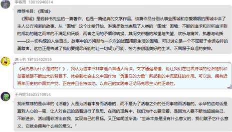 本次马克思主义学院开展的线上读书主题活动,不仅让大家学习到丰富知识,更陶冶了精神,最重要的是有助于养成热爱学习,热爱阅读的好习惯。“读书是无处不可的,于山中可读书,得其空灵;于海上可读书,得其辽阔;于花荫下可读书,得其馨香…”。同学们一致认为,书如同柴、米、油、盐、姜、醋、茶一般,为生活中必须!(马克思主义学院:陈雨旸/文 方媛/图)