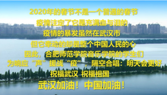 本网讯 近日,在校党委的号召下,在音乐学院党总支、校团委及学工部的组织宣传下,音乐学院投入疫情防控文艺作品创作阵营中,青年学子结合自身的专业特长,采用线上远程录制的方式隔空合唱,为抗疫保卫战发声助力、传递爱心,鼓励人们一起渡过难关,用歌声祝福祖国早日抗疫成功,为武汉加油,为中国加油。