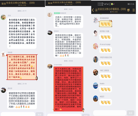 此次评比活动依托QQ直播平台,在线上开展汇报与展示,虽然在形式上与以往有所区别,但是汇报的质量和效果却未有丝毫减少。汇报活动前,各团支部对本支部近期社会主义核心价值观活动月暨雷锋月期间开展的各项活动进行总结和梳理,制作汇报PPT。评比现场,线上主持有条不紊、屏幕共享自然流畅、各支部汇报精彩纷呈,屏幕互动好评如潮。