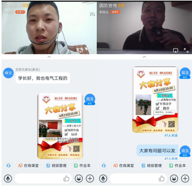 本次活动邀请了武警工程大学和武警警官学院的李晓远和万红兵同学现身说法,讲解参军相关政策的同时分享了自己的军营生活,他们曾经是14级电气工程及其自动化专业的学生,通过自己的努力考上了军校,其中万红兵同学因为表现优秀,还在部队上立了三等功。他们的故事深深的感染了屏幕外的同学们,大家纷纷为之点赞。