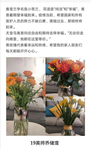 比赛要求既要在照片中体现选手的摄影技术,保证作品在外观上的精美,又要展现出其内涵,体现出社会主义核心价值观。经过评委们的精心筛选,十五位选手的作品脱颖而出,进入决赛。决赛采取观众投票的方式,让更多的人参与进来,结合更多人的审美眼光,更客观选出符合大众审美的作品。因此,学院决定将十五位选手的作品在公众号展出并发起投票,选手们的作品不仅看上去惊艳,其内涵也经得起仔细的推敲。其中,乔储滢同学的作品获得了观众和评委的一致好评。作品展出的是小苍兰、天堂鸟和黄玫瑰,小苍兰的花语是“纯洁”“幸福”,代表着对国家和一线人员的美好祝愿,天堂鸟则是象征着自由、平等的美好社会,黄玫瑰是对家人的关怀,希望家人能够远离烦恼,幸福开心。