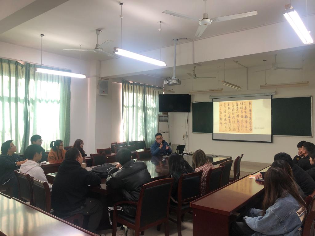 本网讯 艺术传媒学院“庆祝新中国成立70周年经典画作赏析”第三场在艺术楼会议室举行,由艺术传媒学院美术学教工支部书记武蕾老师主讲,以“经典书法作品中的家国情怀”为主题,学生党员、入党积极分子和团员青年代表参加交流。