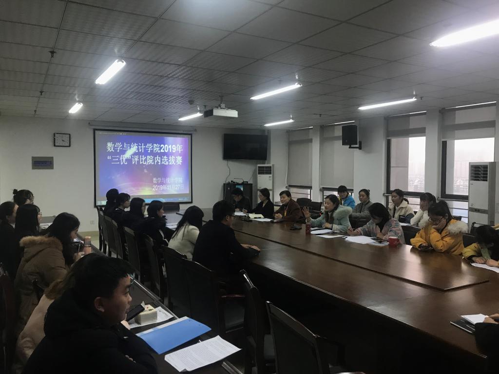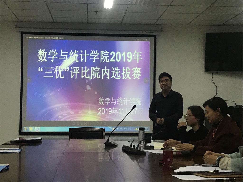 本网讯 为抓实学校“三优”评比工作,进一步增强数学与统计学院学风建设,11月27日中午,数学与统计学院在行知楼1102会议室举办了2018-2019学年“三优”评比院内选拔赛。学院党总支书记郑支农、副书记穆娟、辅导员杨尔飞、王志、周倩、周丽娜等出席会议并担任评委,各班学生代表参加并观摩了本次选拔赛。