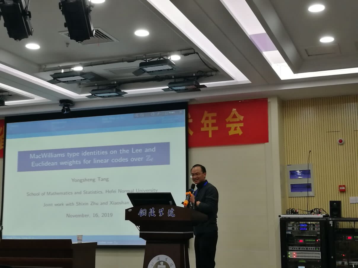 16日下午,小组会议分成高校教学类专题、高校科研类专题和中学组专题分别进行报告交流。我校唐永生博士在高校组科研类专题组作了题为“MacWilliams type identities on the Lee and Euclidean weights for linear codes over Zl”的学术交流分组报告,并与同行作了广泛交流。中学组在铜陵市第一中学进行了分组报告与研讨。我校张新全老师全程参与交流。