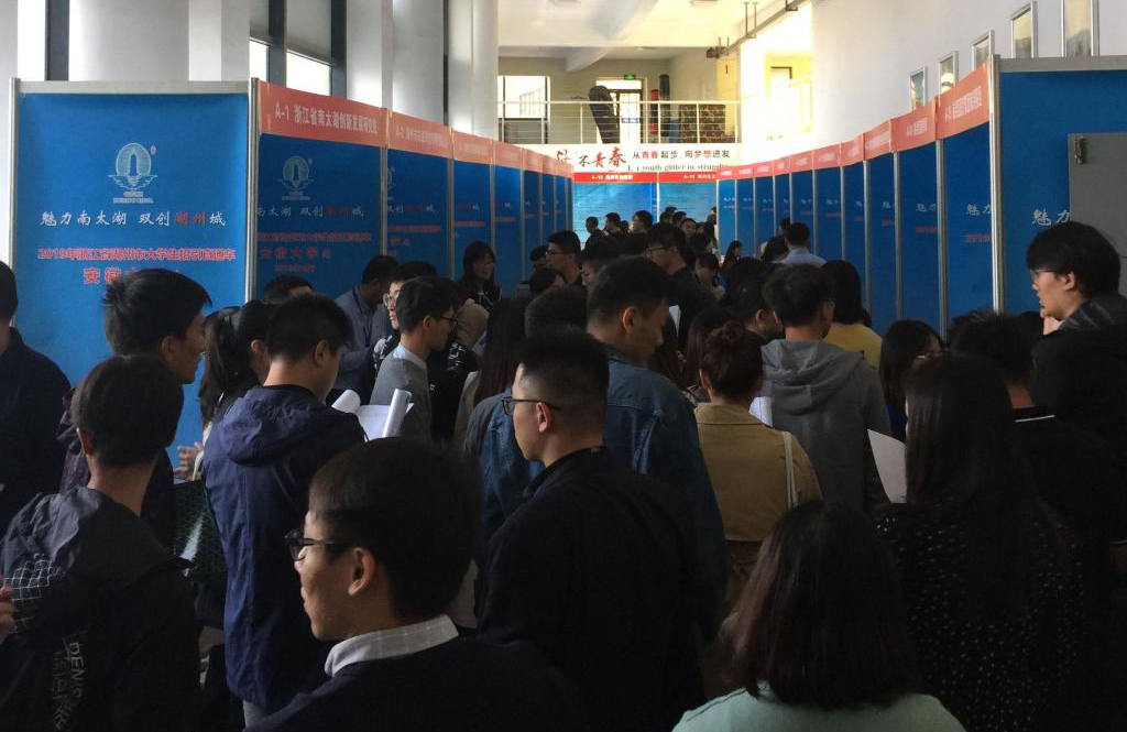 本网讯 10月31日下午,就业创业工作处处长马平带队,外国语学院辅导员江洋和就业创业工作处相关工作人员分别组织各二级学院共计约150余名毕业生赴安徽大学磬苑校区参加2019浙江湖州秋季人才专列合肥专场招聘会。