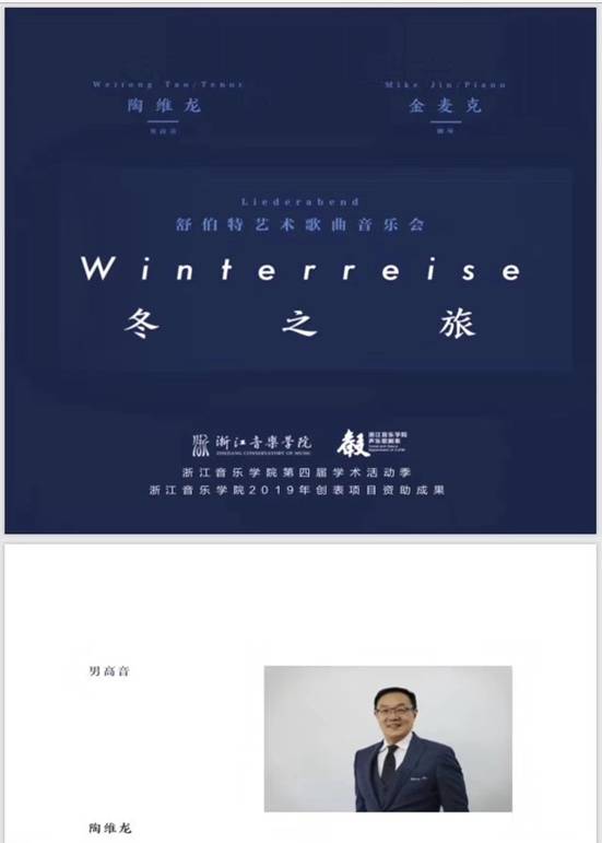 本网讯 由浙江音乐学院声乐歌剧系和音乐学院主办的陶维龙教授舒伯特《冬之旅》艺术歌曲专场音乐会,10月30日晚在音乐厅成功举办,浙江音乐学院青年教师金麦克担任伴奏。