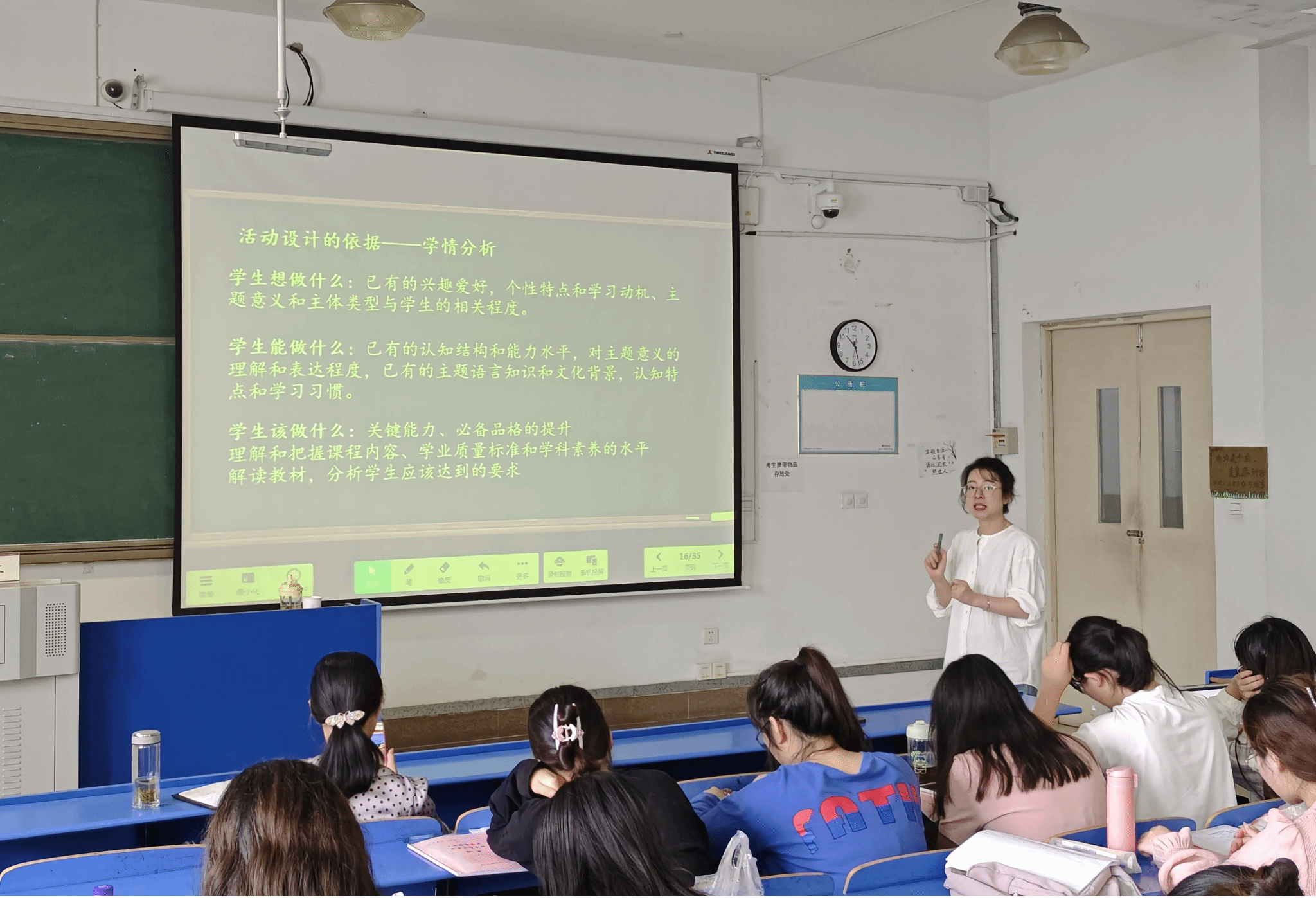 本网讯 为进一步提升小学教育专业师范生的英语教学能力,提高学生未来岗位胜任力,9月28日上午,教育与心理科学学院邀请合肥市育新小学英语教研组组长曹敏在逸夫楼A201教室开展小学英语教学能力提升交流活动,活动由唐银主持。2021级小学教育专业全体学生参加了此次活动。