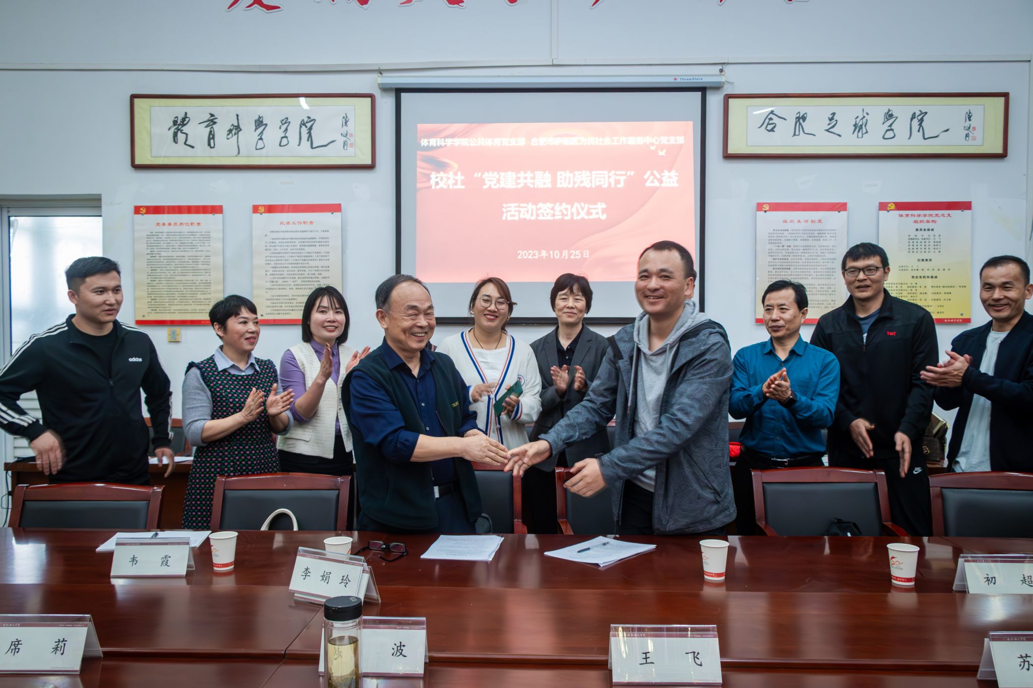 播下一粒种子,收获一片生机;献出一颗爱心,托起一份希望。10月25日下午,体育科学学院公共体育部党支部和合肥市庐阳区为民社会工作服务中心党支部“校社党建共融 助残公益同行”公益活动暨合作签约揭牌仪式在学校锦绣校区体育馆举行。体育科学学院党委书记赵波、党委副书记王飞、副院长席莉出席,合肥市庐阳区为民社会工作服务中心党支部书记李全志、中心老师和孩子们及部分家长代表,公共体育部党支部全体教师党员及各系部师生代表近百人参加。仪式由公共体育部党支部组织委员苏龙主持。