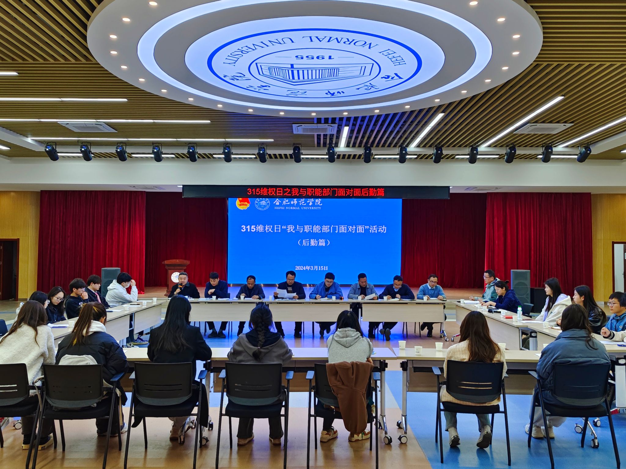 根据学院第六届弘扬社会主义核心价值观活动月安排,为进一步推深做实“我为同学做实事”活动,在第42个“3·15国际消费者权益日”当天,院团委、院学生会联合后勤处在锦绣校区大学生活动中心举行“‘我与职能部门面对面’活动(后勤篇)”,积极畅通信息反馈渠道,维护学生正当权益,共建和谐校园。团委书记、学生工作处处长刁文彬,后勤处处长李建礼,后勤处副处长丁言浩出席活动。后勤处、院团委相关科室负责人、阡陌物业公司经理、院学生会成员及20余名两校区学生代表参与会议。院团委副书记何磊主持活动。