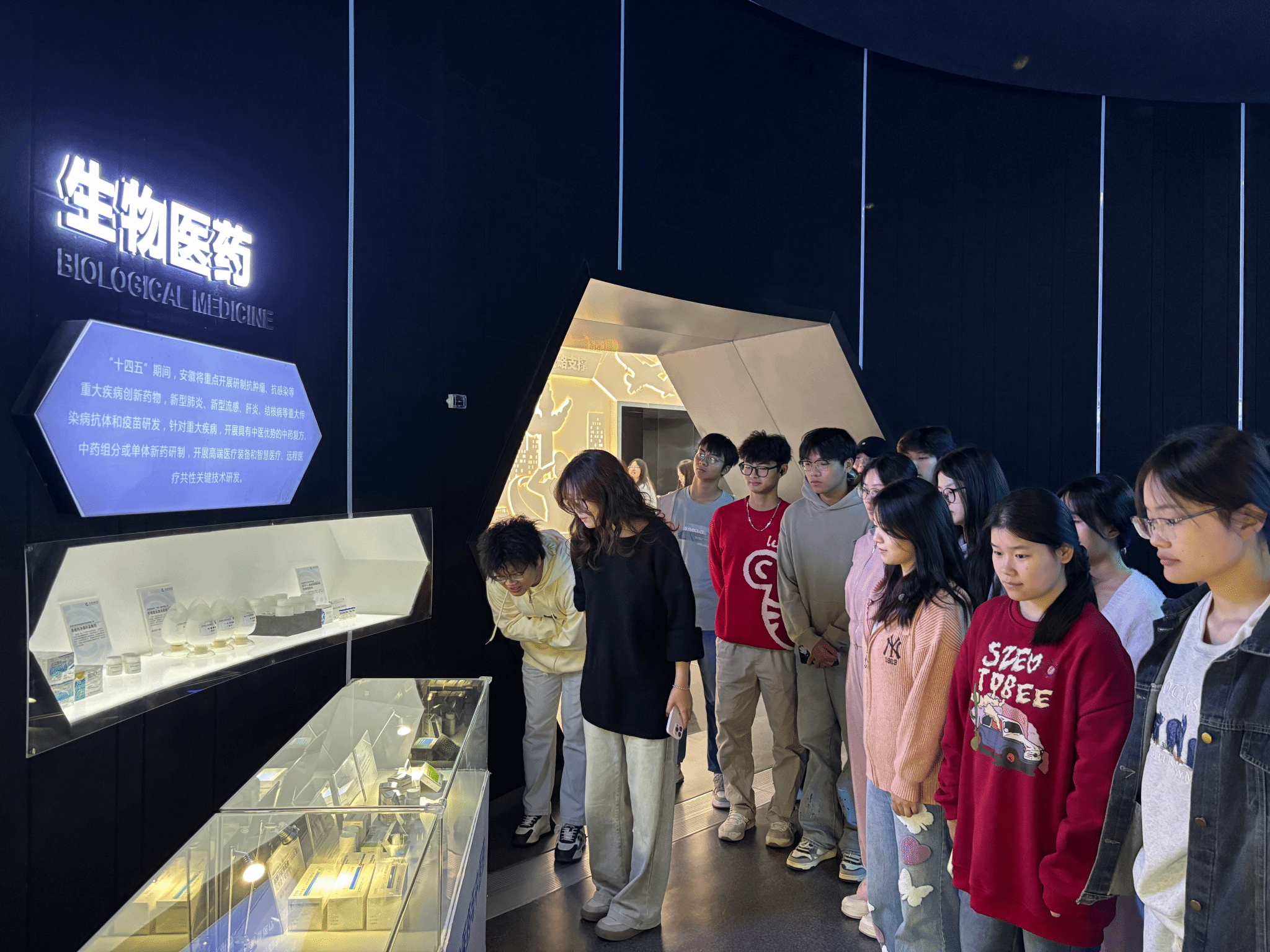 出发前,李万成带领同学们深入学习了习近平总书记10月17、18日考察安徽的重要讲话精神。在创新馆,同学们逐个参观了人工智能、量子信息、现代生物科技等众多领域的高端科研成果。世界首台量子计算机、世界首颗量子通信卫星“墨子号”、0.12毫米世界最薄玻璃……同学们被安徽科技创新的魅力与活力感染。特别是在生物医药展区,同学们边看边讨论边记录,纷纷表示要培养自己的创新思维,为推动生物制药领域的发展贡献自己的力量。