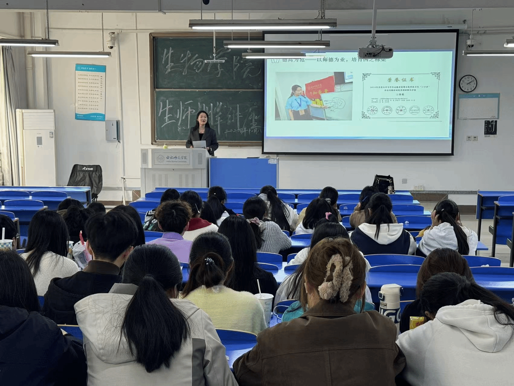 为全面贯彻党的教育方针和习近平总书记关于教育的重要论述,进一步营造“勤习慎思、品学兼优”的学习氛围,11月8日,生物与食品工程学院在逸夫楼A107举办第一期“‘奖’给你听”学风建设主题讲座。本次讲座邀请了我校2022届生物科学(师范)毕业生党员、南京师范大学硕士生、无锡市洛社高中生物教师辛淑静校友,生物与食品工程学院2023级师范专业全体学生听取讲座,讲座由学生第二党支部书记、辅导员徐浩然主持。
