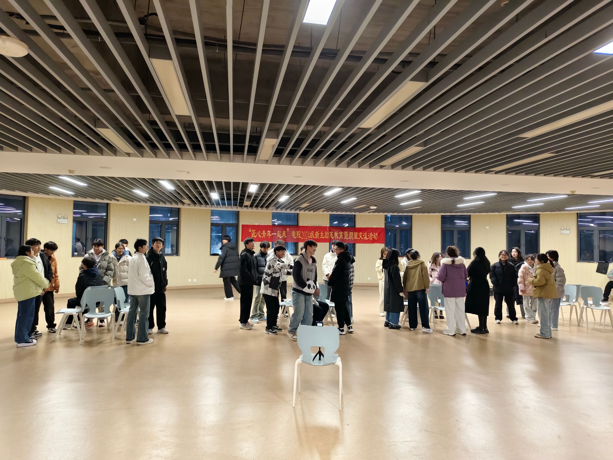为更好地帮助2024级新生适应大学生活、健康成长成才,12月15日晚,在学院一站式学生社区“匠心青年”心理工作站指导下,电子信息与集成电路学院2024级电信工程专业和通信工程专业班级在滨湖校区铭传楼3楼连廊举办“匠心青年一起来”2024级新生励志教育暨朋辈交流活动。