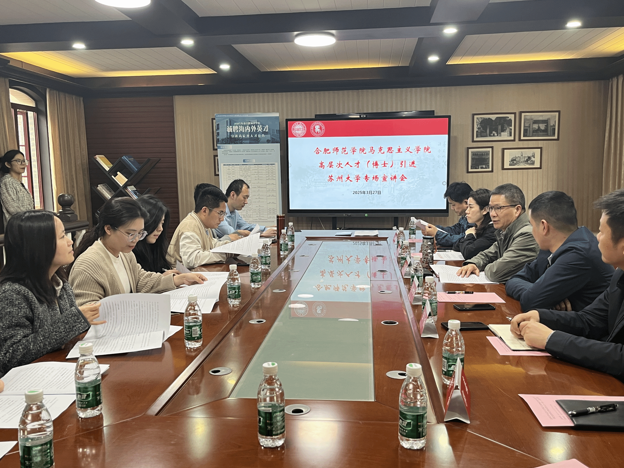 为进一步提升马克思主义学院学科建设水平,加强高校间的交流合作,积极推进学院高层次人才引进力度,3月27日,马克思主义学院院长何光辉、人事处副处长胡婷婷率队赴苏州大学开展交流学习暨高层次人才引进宣讲会。