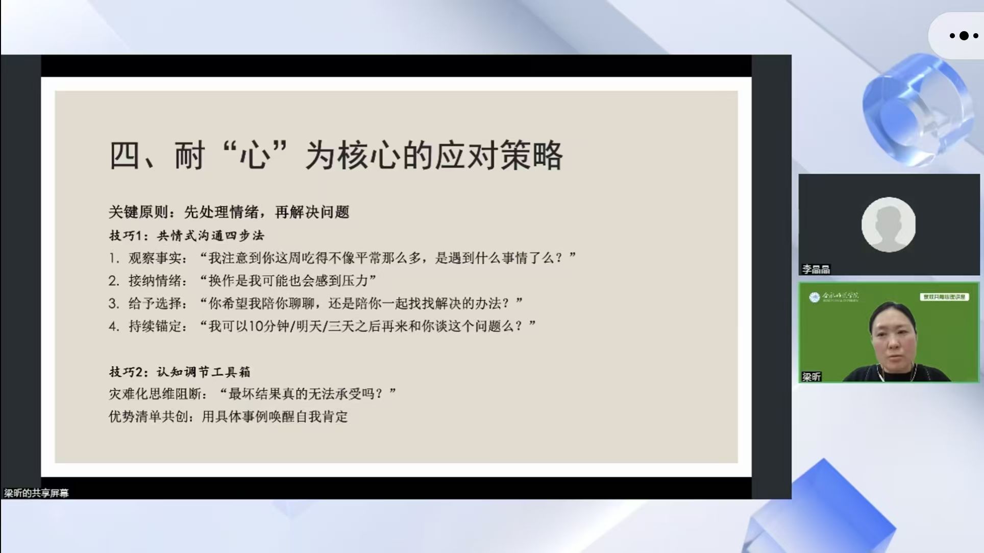 梁昕老师从大学生心理健康现状入手,探讨了大学生心理发展核心特点,包括自我认同的探索与重构、情绪体验的“过山车”模式和关系需求的矛盾等方面。随后,就大学生在校园成长中的常见挑战,提出三“心”应对策略:一是用“心”为基础的观察策略,特别介绍了常用观察方式的具体脉络;二是耐“心”为核心的应对策略,重点讲解了“先处理情绪再解决问题”的关键原则;三是细“心”为原则的干预策略,主要说明了需要干预的7种情况以及干预策略。最后,着重强调家长在面对孩子心理健康困扰时需要传递给孩子“我一直都在”的心理支持理念。讲座现场,氛围热烈,学生及家长认真观看,积极互动。