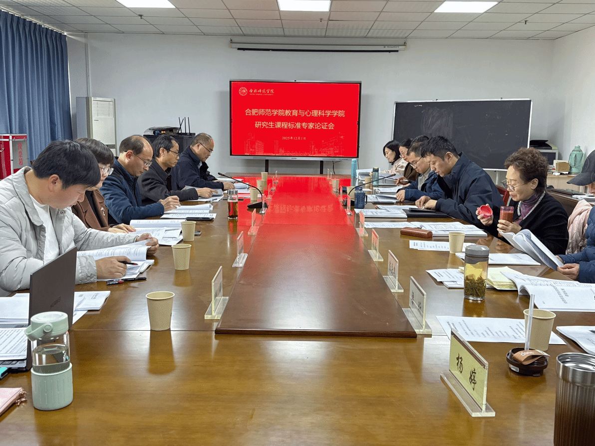 12月1日下午,教育与心理科学学院在锦绣校区行知楼710会议室举办研究生课程标准专家论证会。会议邀请安徽师范大学教育科学学院吴支奎教授、合肥大学教育学院陈媛副教授、六安市裕安区教体局教师发展中心黄孝玉副主任、合肥市阳光中学党支部副书记宣守强,以及校内数学与统计学院院长杨刘、文学院副院长甘松、外国语学院研究生教学部主任强云等7位专家参加论证,为研究生课程标准建设提供专业指导。教育与心理科学学院院长唐烨伟、相关课程负责人和课程团队成员参加会议。会议由教育与心理科学学院副院长胡哲主持。