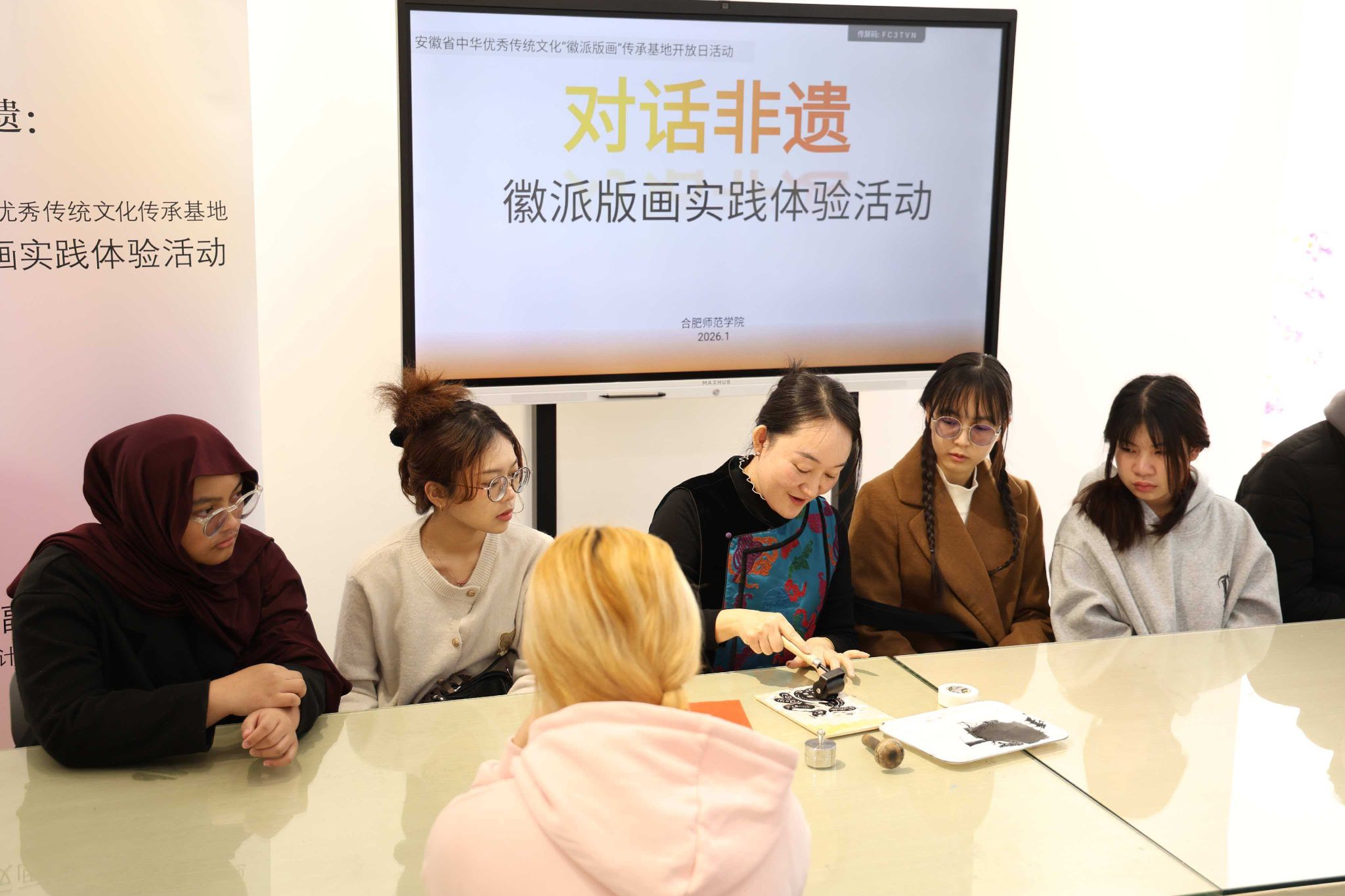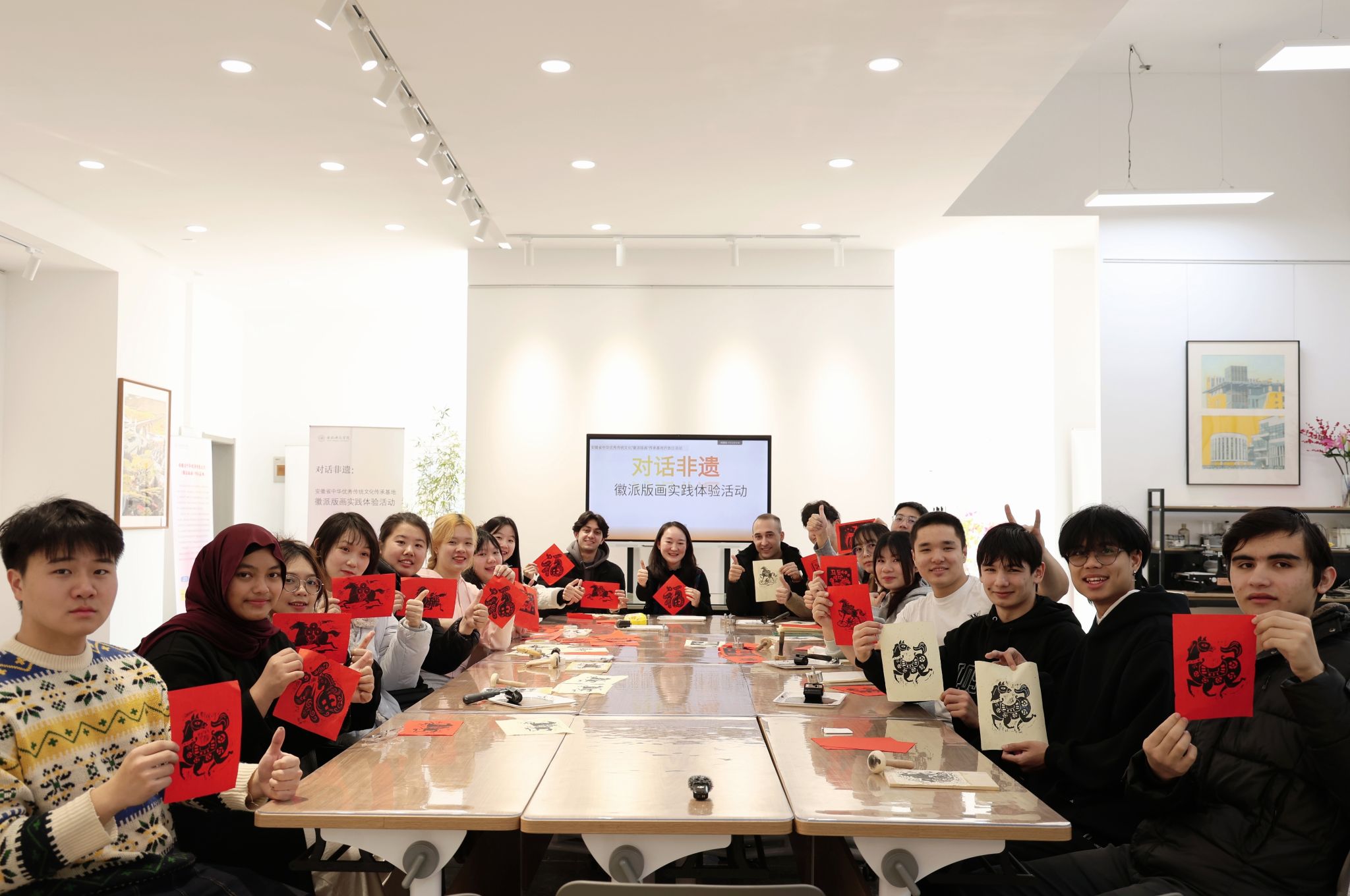 为了持续推进我校国际生“国情教育”文化体验实践活动,1月13日,国际教育学院与美术与设计学院联合组织14名留学生走进安徽省中华优秀传统文化徽派版画传承基地,沉浸式体验徽派版画技艺。