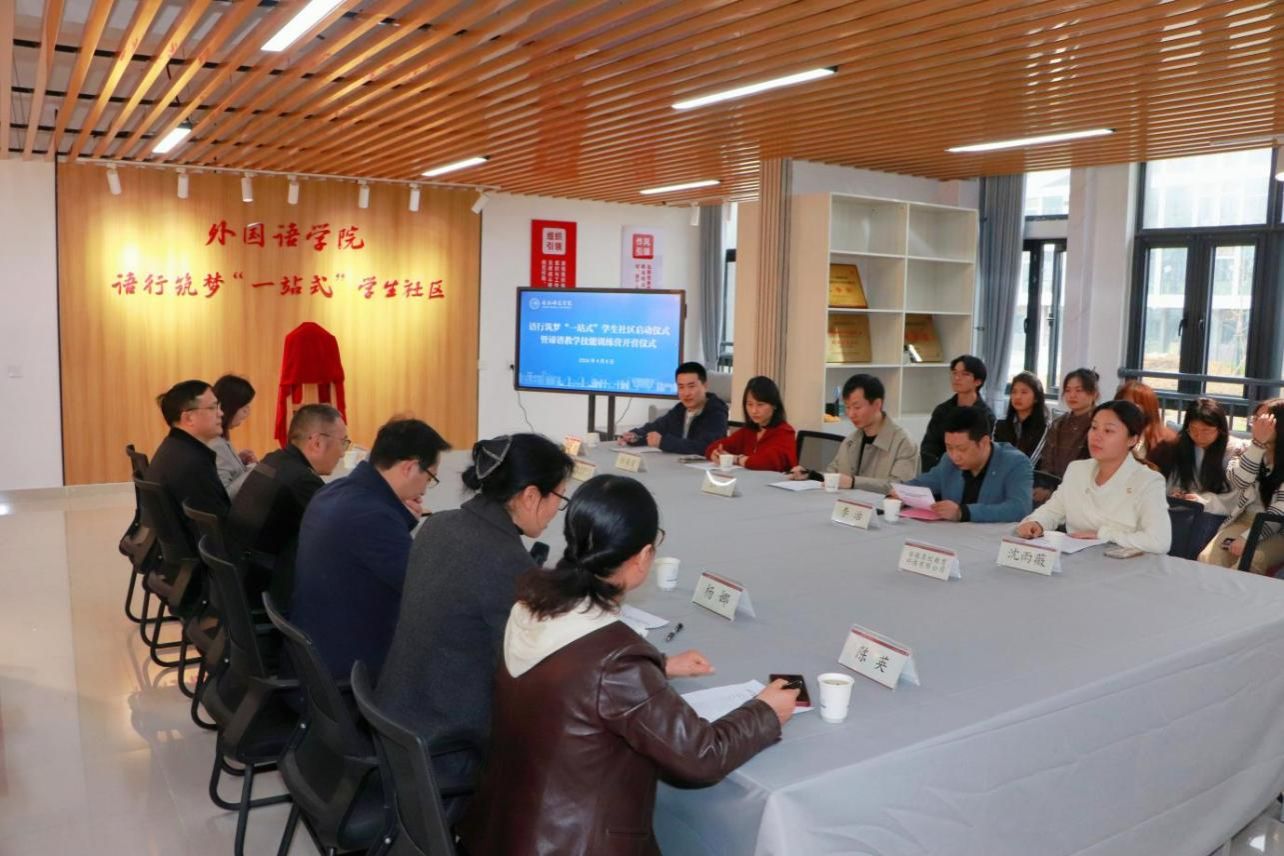 4月8日下午,外国语学院在滨湖校区9栋学生宿舍108室举行语行筑梦“一站式”学生社区启动仪式暨谛谱教学技能训练营开营仪式。安徽鼎校教育科技有限公司总监李治、安徽谛谱教育咨询有限公司总经理张卿,校学生工作部副部长尚金梅、教务处副处长范程华,外国语学院院长李可胜、党委副书记杨娜、副院长吴礼敬出席活动。相关企业人员、辅导员、训练营负责老师及全体营员参加。仪式由杨娜主持。