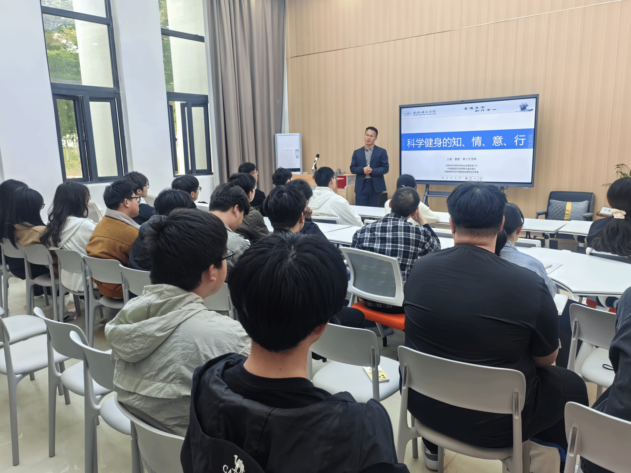4月8日下午,为积极构建健康校园,推动“健康第一”理念走深走实,“阅+历”读书讲堂滨湖校区第三期讲座如期开讲。本次讲座以《科学健身的知、情、意、行》为主题,特邀体育科学学院教授、硕士生导师王强担任主讲嘉宾,马克思主义学院陶常梅老师担任主持,60余名选课学生到场聆听。