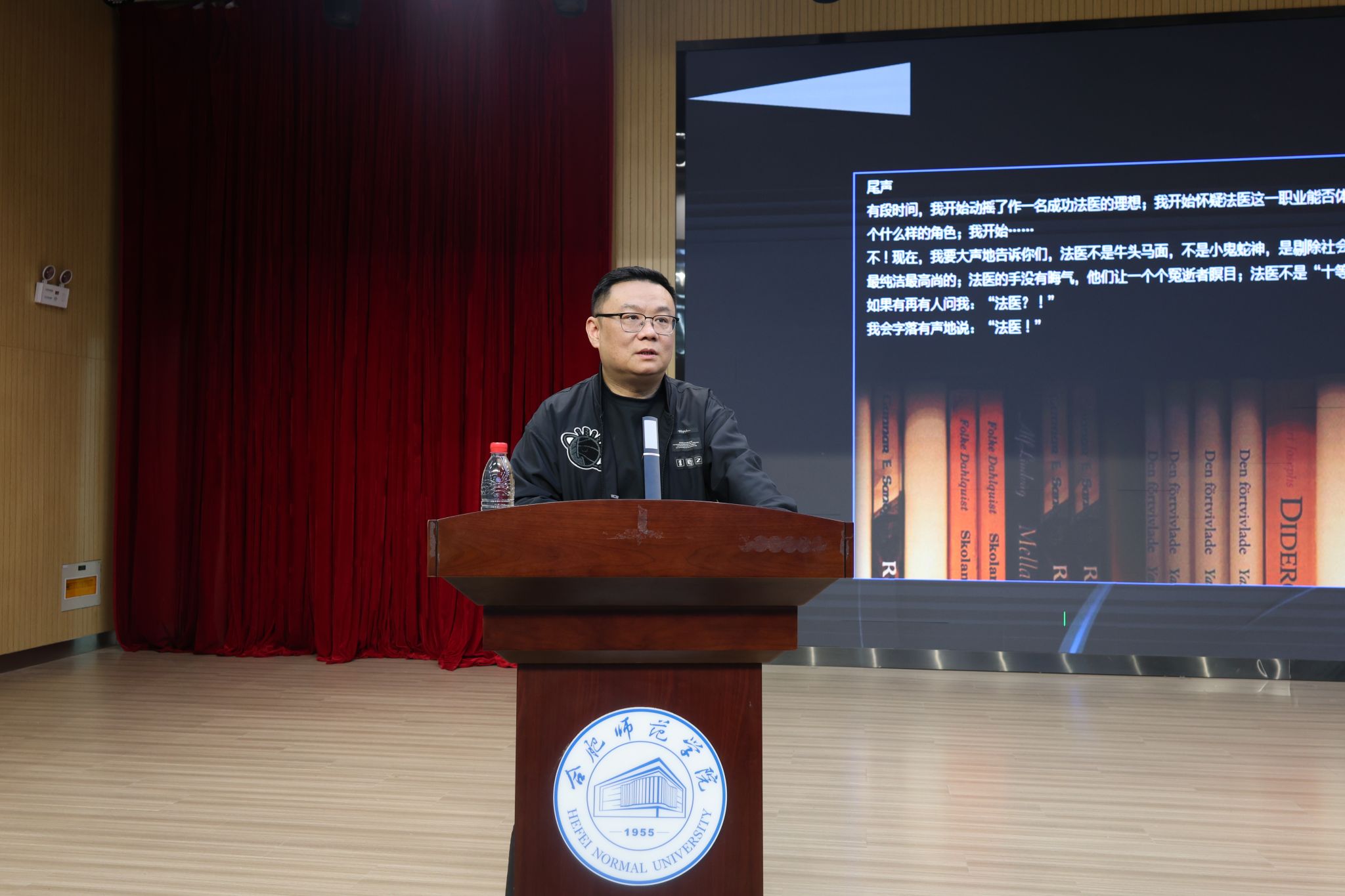 为广泛开展全民阅读活动周活动,推进书香合师建设,在世界读书日到来之际,4月22日晚,校团委、校学生会在锦绣校区大学生活动中心成功举办“解读最后的语言,书写无声的真相”法医秦明读书分享会。本次活动特邀安徽省公安厅刑事侦查总队警务技术四级主任、知名作家秦明担任主讲嘉宾,校党委委员、宣传部部长、统战部部长常树宝、教务处处长钱立青、图书馆馆长方孝玲、校团委书记刁文彬参加活动。本次活动面向全校师生开放,吸引600余名师生到场参与,现场座无虚席、氛围热烈。