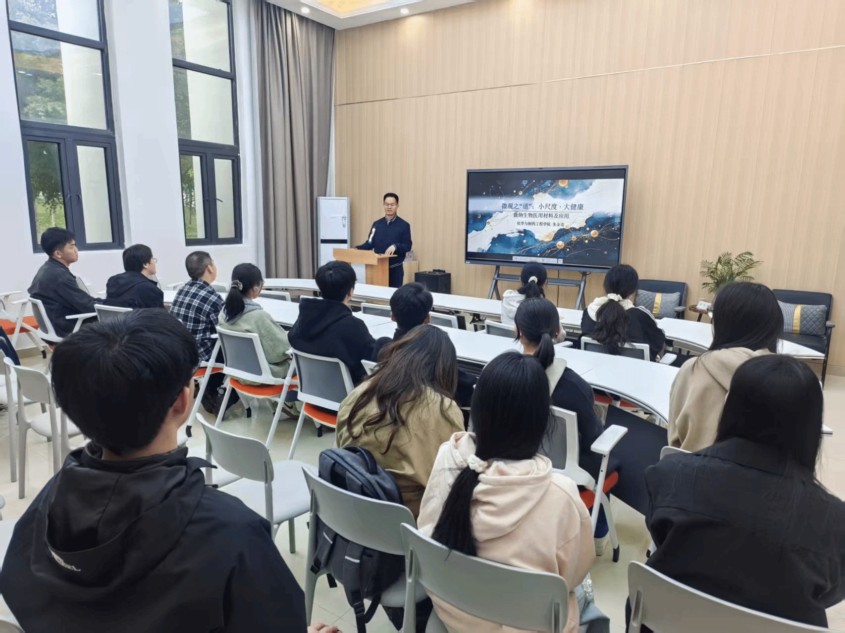 朱金苗教授围绕讲座主题展开分享,从精准药物递送、智能医疗器械到组织工程与再生医学,系统阐释了微纳生物医用材料如何以“看不见”的方式重塑现代医疗与健康生活。他重点讲解了微纳尺度下材料的独特性质、关键制备技术与典型应用场景,通过生动案例展示了微小尺度材料在疾病诊断、治疗及健康守护领域的巨大变革,让同学们直观感受到前沿科技与民生健康的深度联结。讲座过程中,同学们积极与朱教授互动交流,现场氛围热烈融洽,不少同学表示对前沿科技产生了浓厚兴趣,未来将主动探索科技前沿、揭秘自然奥秘。最后,朱教授勉励同学们:“在校期间在自己的专业上勤学苦练,未来为国家的科学事业贡献自己的一份光与热。”(教务处:方晓磊)