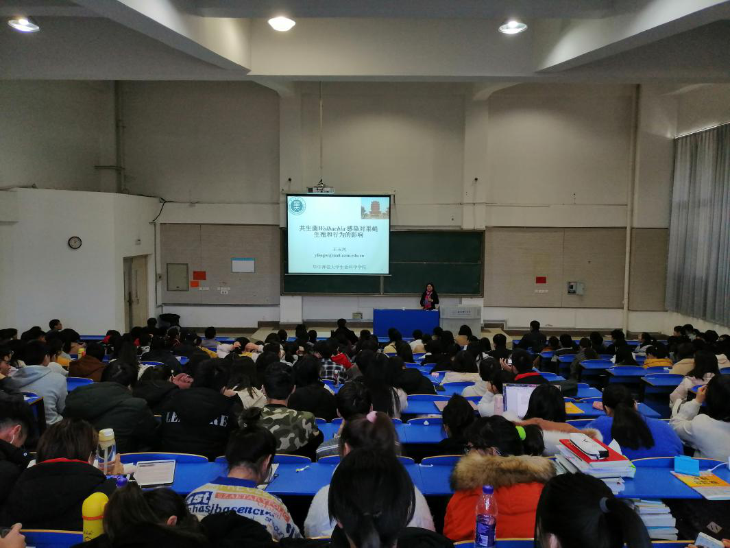 本网讯 12月4日下午14点,应生命科学学院邀请,华中师范大学教授、博士生导师王玉凤在逸夫楼西阶2教室,为生科院师生作了题为《共生菌Wolbachia感染对果蝇生殖和行为的影响》学术报告,生科院师生300多人齐聚一堂聆听了报告,报告由生命科学学院院长徐忠东教授主持。