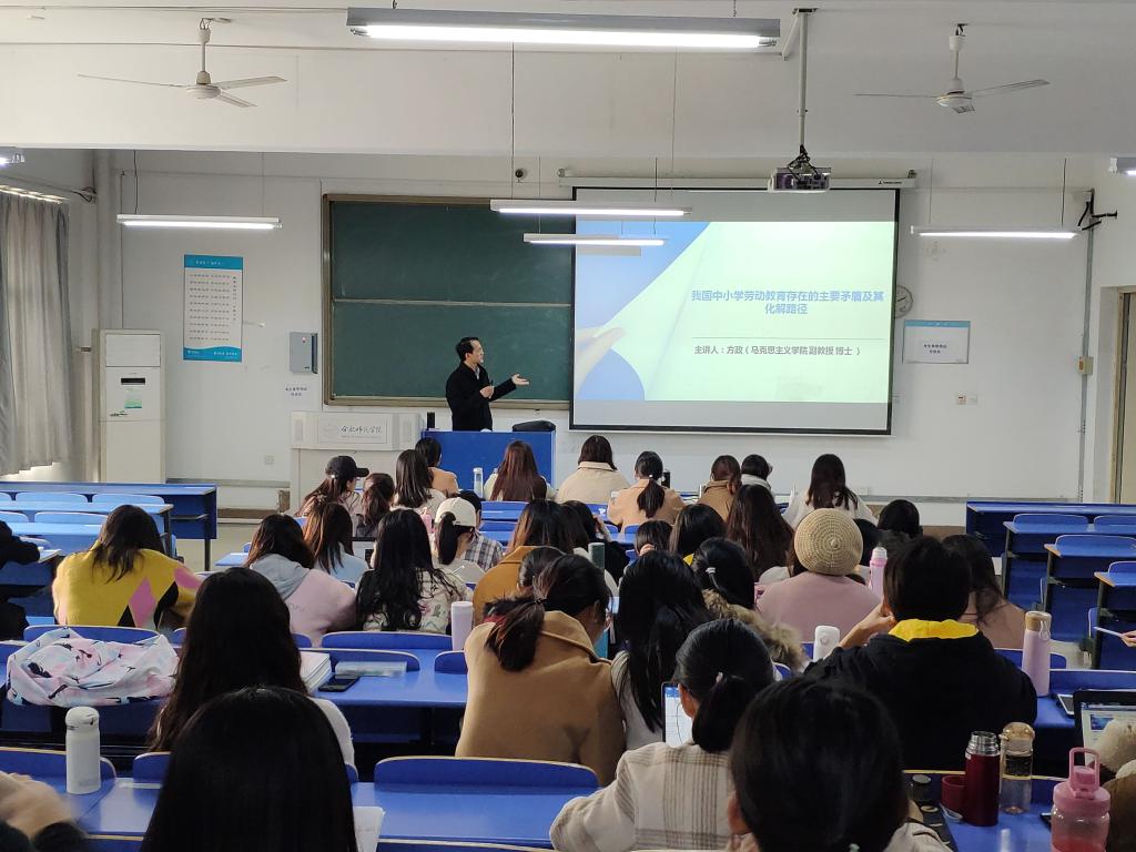 本网讯 为营造良好的学术氛围与解读国家教育方针,11月21日下午,马克思主义学院副教授方政老师(校内研究生导师)为2019级研究生作题为《我国中小学劳动教育面临的主要矛盾及其化解路径》的学术报告,本次学术报告由研究处与马克思主义学院共同主办,2019级研究生近50人听取了报告。