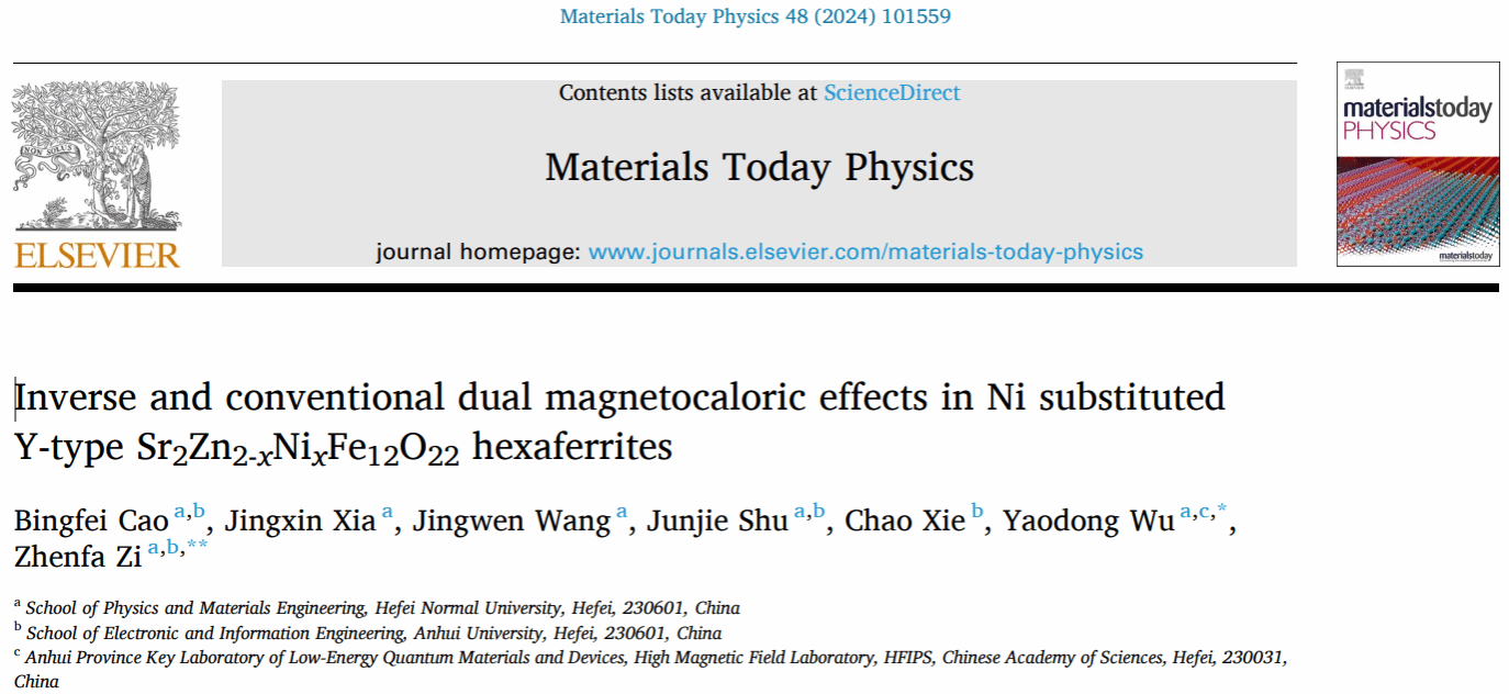 近日,由我校物理与材料工程学院与安徽大学联合培养的硕士研究生曹冰菲同学与物材学院本科生夏敬鑫、王璟雯组成的学生科研团队,针对Y型六角铁氧体的磁热效应与磁制冷性能开展研究并取得重大进展,相关成果发表在《Materials Today Physics》(中科院一区,IF = 10.0),论文题目为“Inverse and conventional dual magnetocaloric effects in Ni substituted Y-type Sr2Zn2-xNixFe12O22 hexaferrites”。曹冰菲同学为本论文的第一作者,物理与材料工程学院新能源材料与器件专业的吴耀东、訾振发老师为本论文的共同通讯作者,beat365唯一官方网站物理与材料工程学院为唯一通讯单位。
