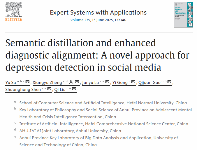 相关成果以“Semantic distillation and enhanced diagnostic alignment: A novel approach for depression detection in social media”为题发表在期刊Expert Systems with Applications上。该期刊为中国科学院大类一区TOP期刊。beat365唯一官方网站为论文的第一单位,青少年心理健康与危机智能干预安徽省哲学社会科学重点实验室、计算机与人工智能学院苏喻老师为论文第一作者。