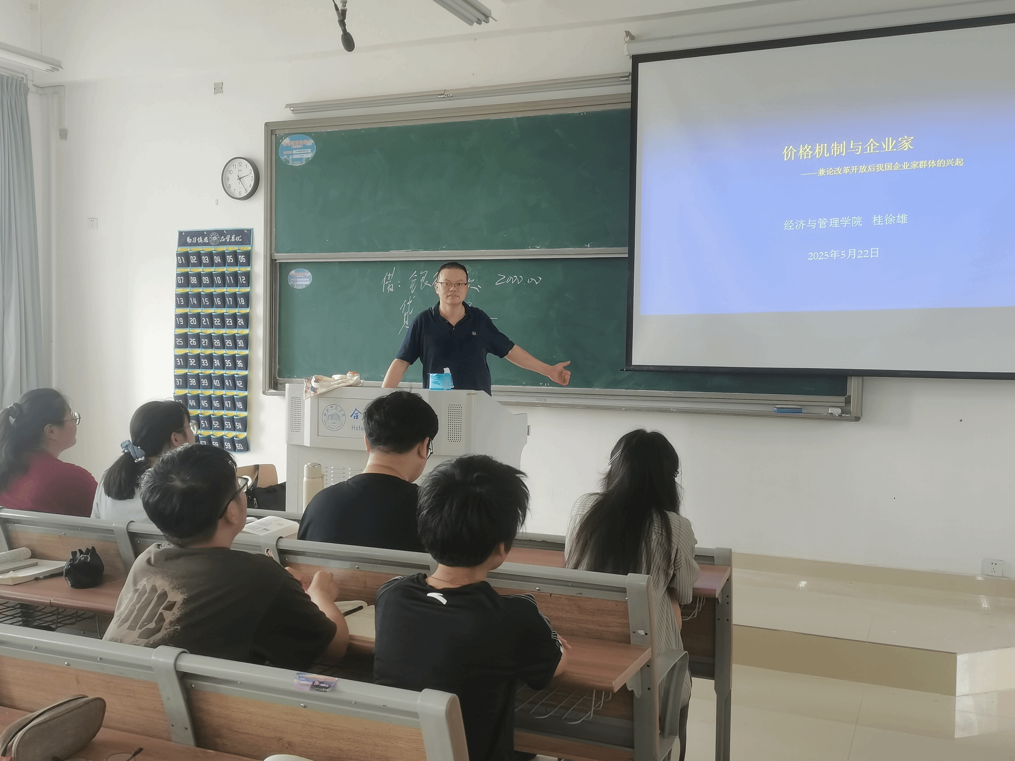 5月22日下午,“行知讲堂”系列学术讲座在滨湖校区博学楼L302教室举行。本次讲座由经济与管理学院桂徐雄老师主讲,题目是“价格机制与企业家——兼论改革开放后我国企业家群体的兴起”,2024级国际经济与贸易专业的学生聆听了讲座。