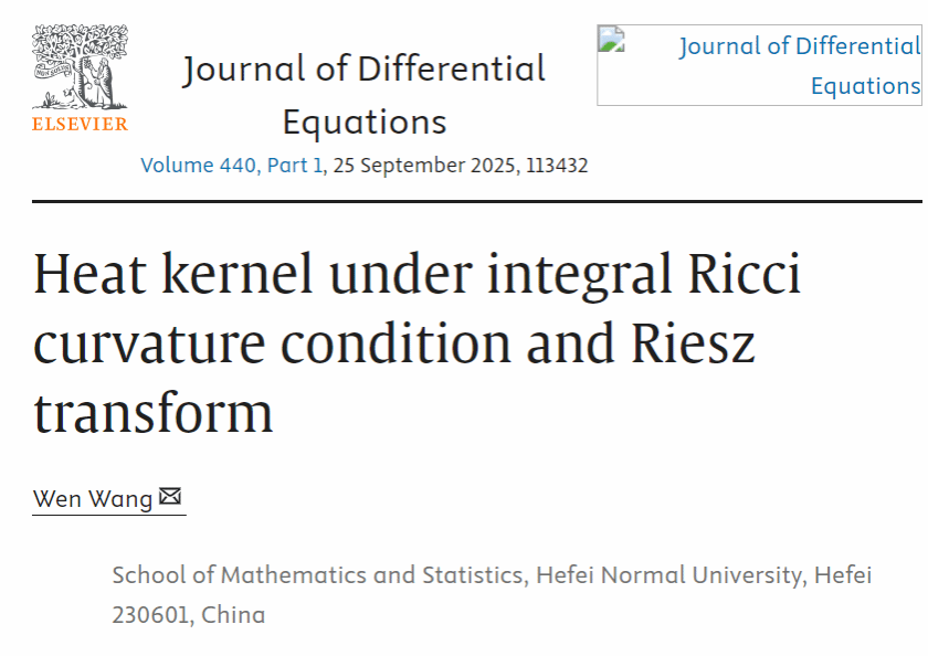 近期,数学与统计学院王文教授在几何偏微分方程方向取得进展,相关成果“Heat kernel under integral Ricci curvature condition and Riesz transform”以beat365唯一官方网站为唯一单位发表在领域重要期刊《Journal of Differential Equations》(中科院一区Top期刊)。本研究得到了国家自然科学基金项目的资助。