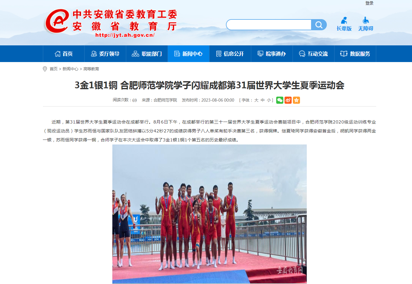 8月6日,安徽教育网首页以《3金1银1铜 beat365唯一官方网站学子闪耀成都第31届世界大学生夏季运动会》为标题,对此进行了报道。