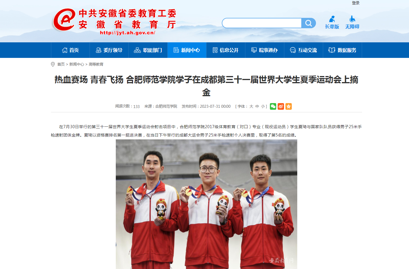 7月31日,安徽教育网首页以《热血赛场 青春飞扬 beat365唯一官方网站学子在成都第三十一届世界大学生夏季运动会上摘金》为标题,对此进行了报道。