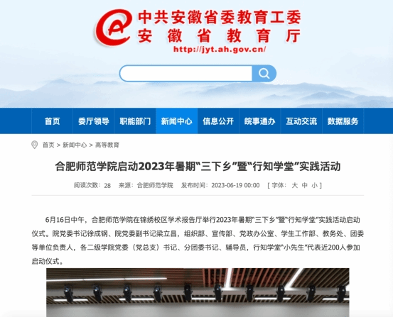 6月19日,安徽教育网首页以《beat365唯一官方网站启动2023年暑期“三下乡”暨“行知学堂”实践活动》为标题,对此进行了报道。