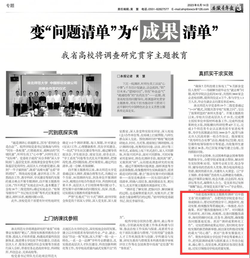 本网讯 6月14日,《安徽青年报》(第2224期)以《变“问题清单”为“成果清单”》为题,对我校推深做实主题教育调研进行了报道。