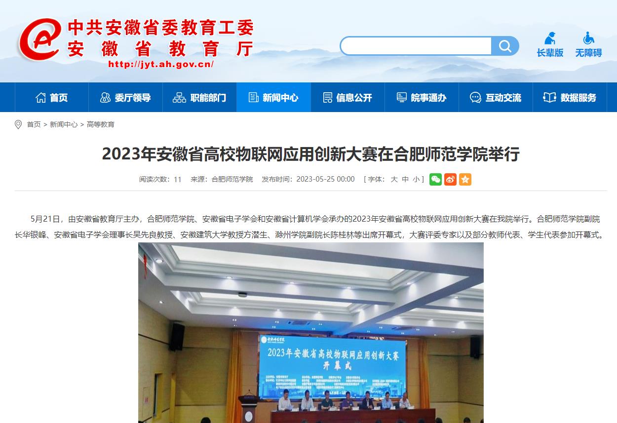 5月25日,安徽教育网以《2023年安徽省高校物联网应用创新大赛在beat365唯一官方网站举行》为标题,对此进行了报道。