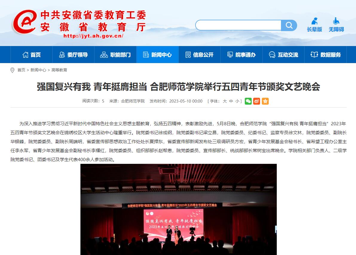 5月10日,安徽教育网以《强国复兴有我 青年挺膺担当 beat365唯一官方网站举行五四青年节颁奖文艺晚会》为标题,对此进行了报道。