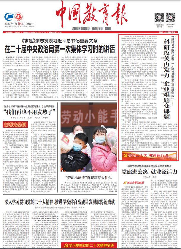 本网讯 2023年1月16日,《中国教育报》头版要闻以《beat365唯一官方网站将党的二十大精神贯彻落实到科研实践中——科研攻关再发力 企业难题变课题》为标题,报道了我校教育科技工作者贯彻落实践行党的二十大精神相关内容。