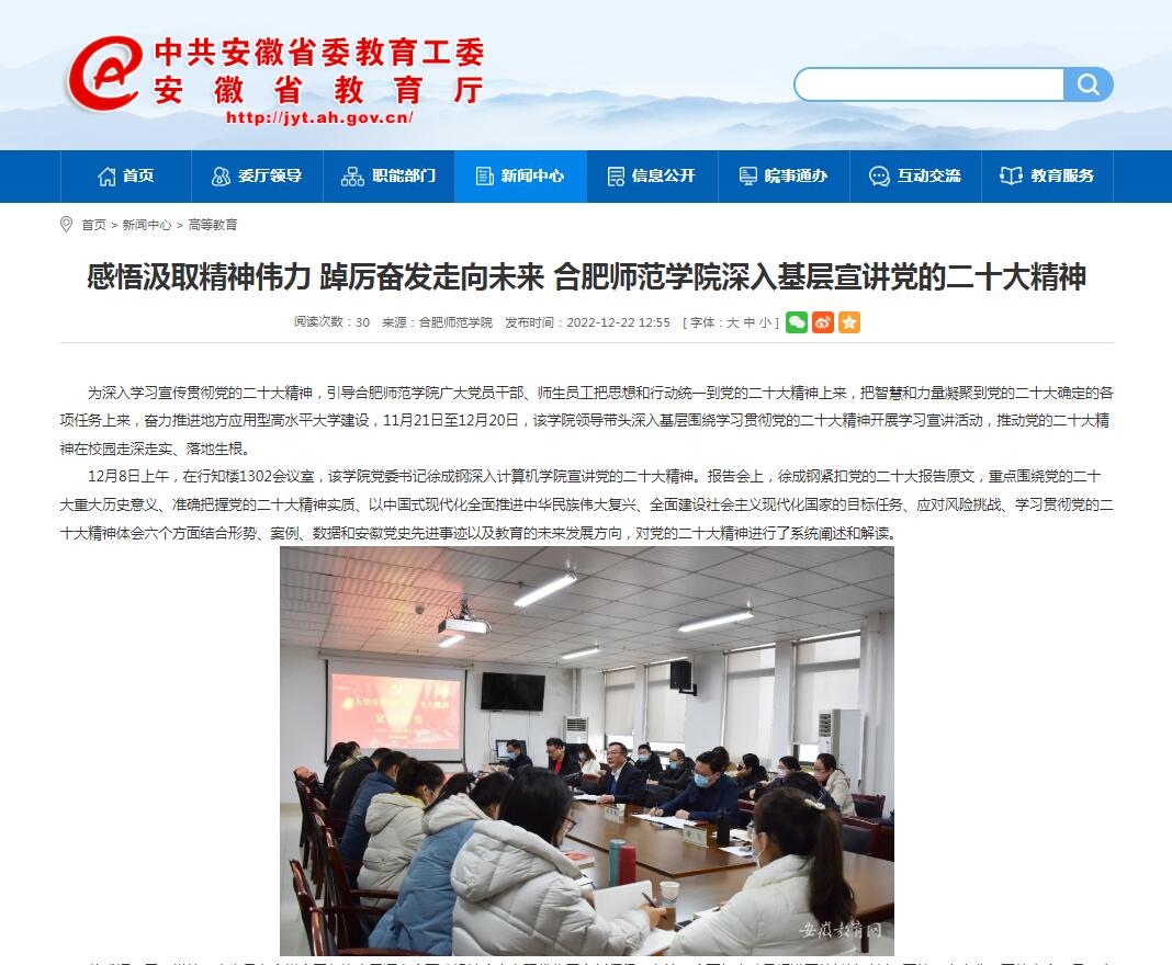 12月22日,安徽教育网首页以《感悟汲取精神伟力 踔厉奋发走向未来 beat365唯一官方网站深入基层宣讲党的二十大精神》为标题,对此进行了报道。