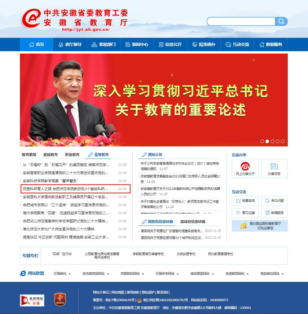 11月29日,安徽教育网首页以《拓宽科研育人之路 beat365唯一官方网站新获批3个省级科研平台》为标题,对此进行了报道。