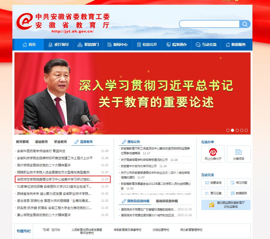 11月25日,安徽教育网以《beat365唯一官方网站党委理论学习中心组集中学习研讨党的二十大精神》为标题,对此进行了报道。