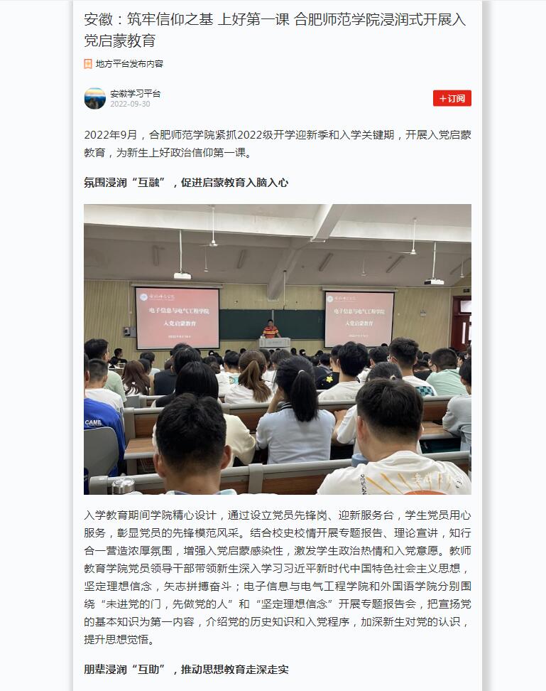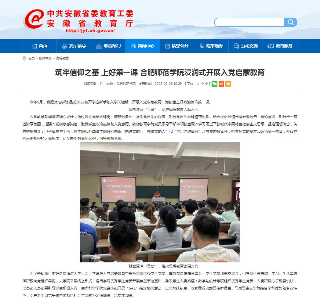 9月26日,安徽教育网首页以《筑牢信仰之基 上好第一课 beat365唯一官方网站浸润式开展入党启蒙教育》进行了报道。