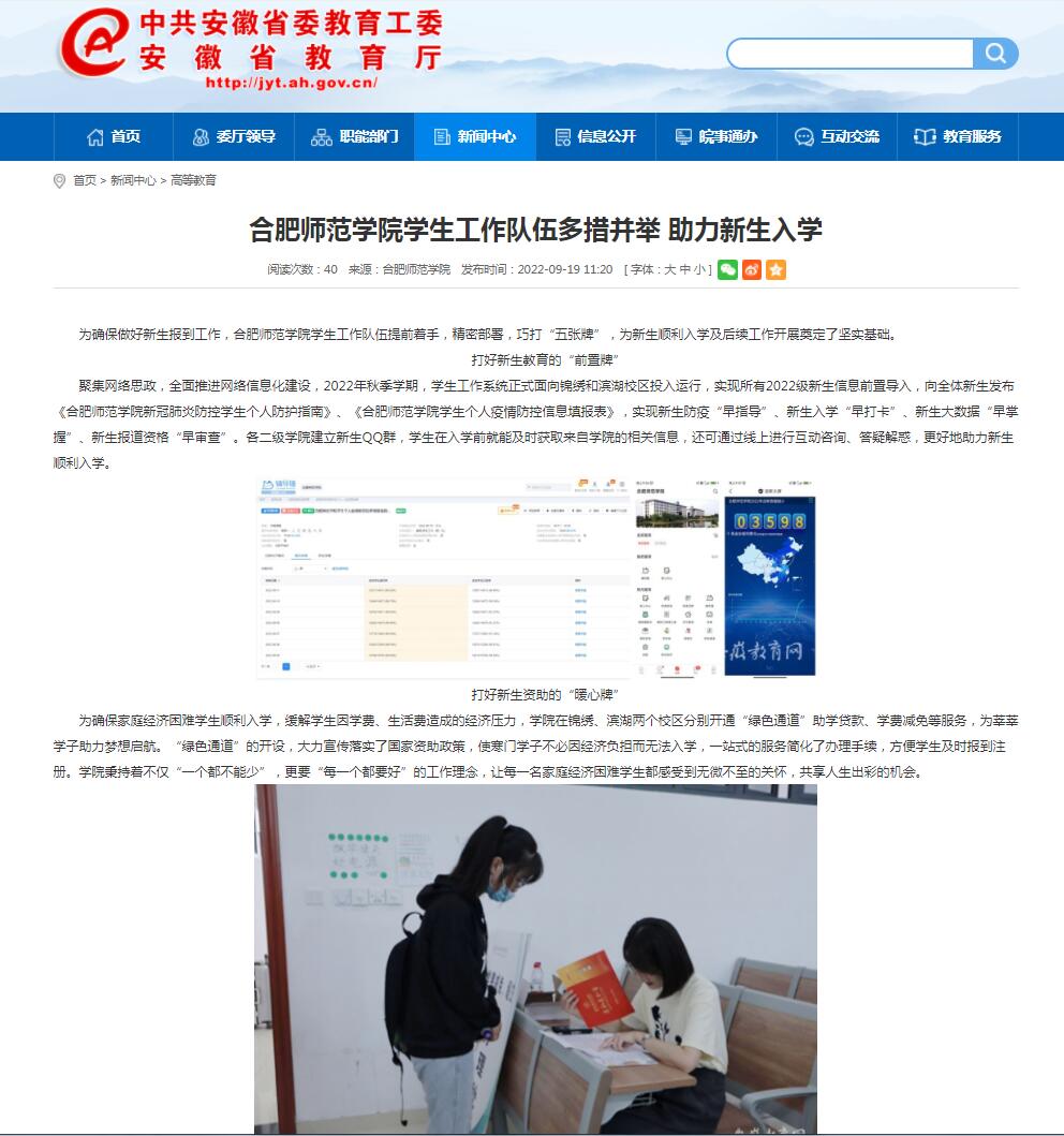 9月19日,安徽教育网首页以《beat365唯一官方网站学生工作队伍多措并举 助力新生入学》为标题进行了报道。