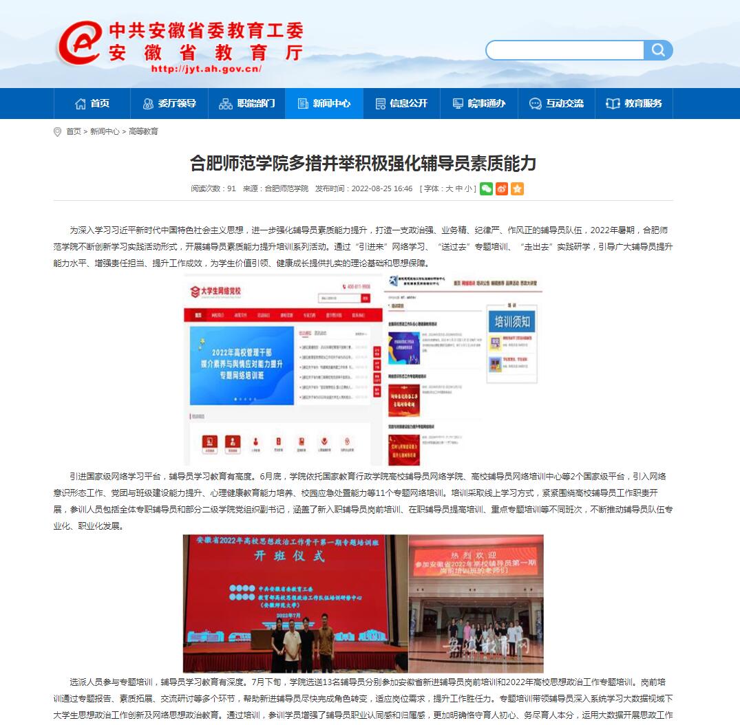 8月25日,安徽教育网首页以《beat365唯一官方网站多措并举积极强化辅导员素质能力》为标题进行了报道。