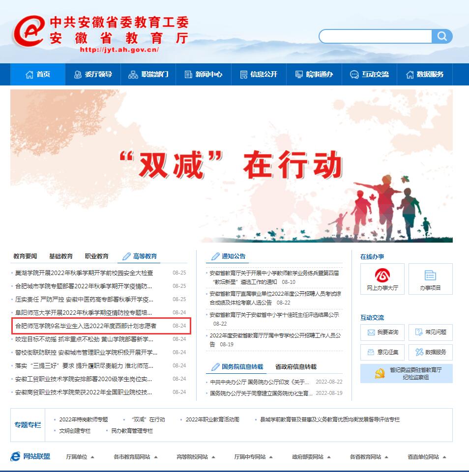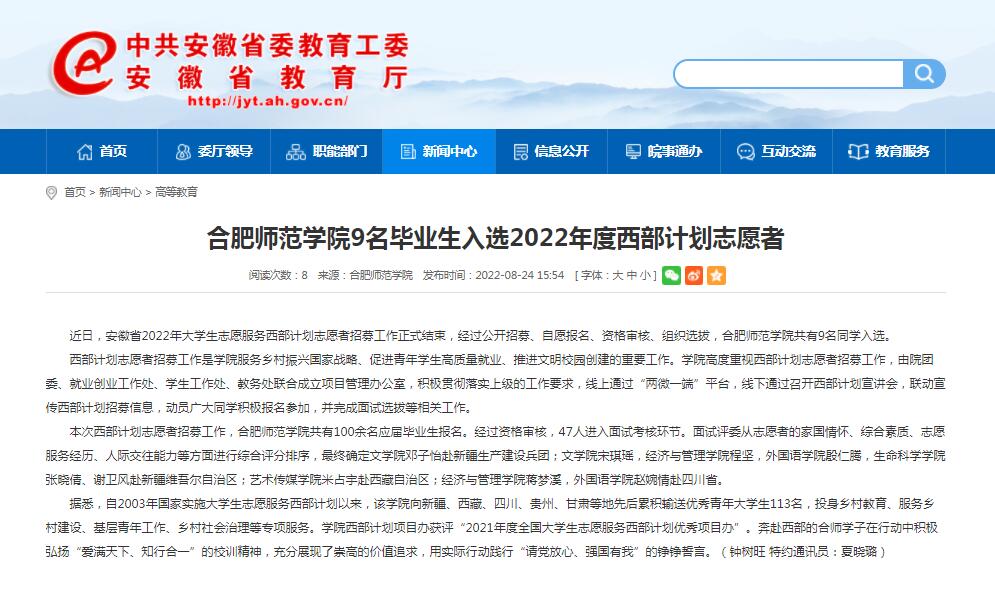 8月24日,安徽教育网首页以《beat365唯一官方网站9名毕业生入选2022年度西部计划志愿者》为标题进行了报道。