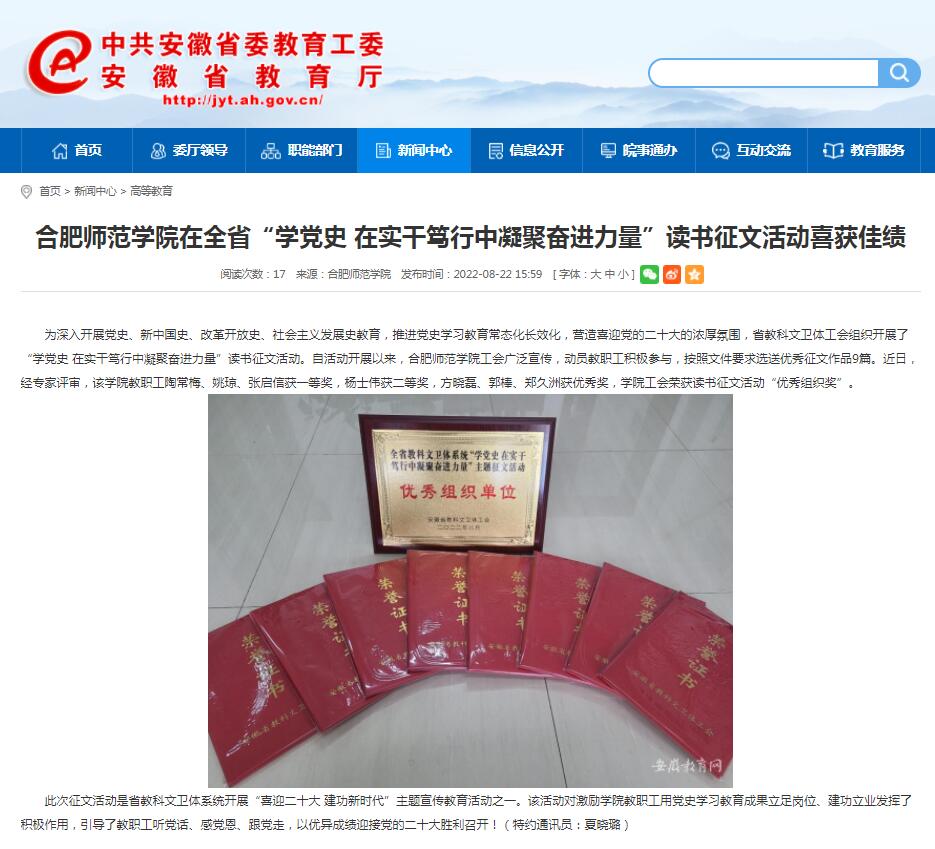本网讯 8月22日,安徽教育网报道我院在全省“学党史 在实干笃行中凝聚奋进力量”读书征文活动喜获佳绩。经专家评审,学院教职工陶常梅、姚琼、张启信获一等奖,杨士伟获二等奖,方晓磊、郭棒、郑久洲获优秀奖,学院工会荣获读书征文活动“优秀组织奖”。
