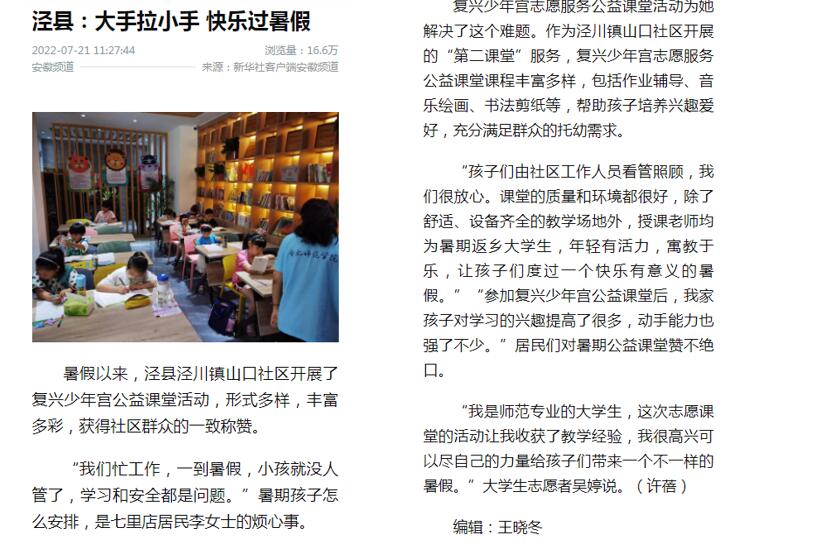 近日,新华社客户端安徽频道以《泾县:大手拉小手快乐过暑假》对院团委泾县行知学堂开展公益课堂活动进行了报道。(院团委)
