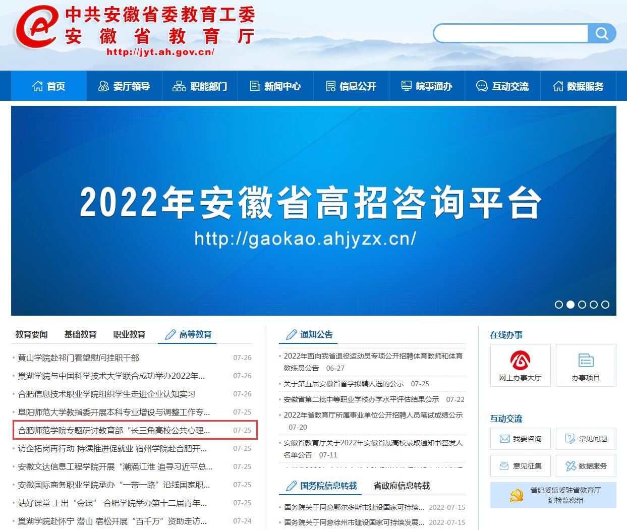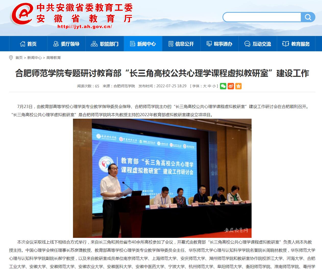 7月25日,安徽教育网首页以《beat365唯一官方网站专题研讨教育部“长三角高校公共心理学课程虚拟教研室”建设工作》为标题进行了报道。